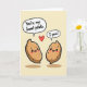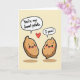 This Valentine’s Day card shows two friendly root vegetables sharing a sweet moment together on a soft creamy-yellow background. They resemble happy sweet potatoes, with round brown bodies, shiny black eyes, rosy cheeks, and big smiling expressions. Each character stands close, with gentle shading beneath them that adds depth. Speech bubbles carry the message: one says, “You’re my Sweet potato,” and the other replies, “I yam!” A small red heart floats between them to highlight their bond. The warm colors, clear expressions, and clever wordplay make this card a charming way to share affection, humor, and love ❤️💌🍫.