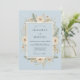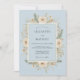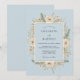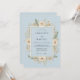 This design features a serene palette of ice blue and creamy white, perfect for a cold-weather event. Delicate white anemones are surrounded by sprigs of evergreen pine and dried foliage in earthy tan tones. The botanical arrangement creates a soft, natural aesthetic that evokes the quiet beauty of a snowy forest.