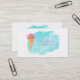 A yummy business card template with a delicious ice cream cone illustration, with a scoop of pink strawberry ice cream held by a waffle cone. Set on an aqua blue watercolor paint splatter / brushstroke. Nice design for ice-cream makers and other related businesses.