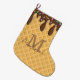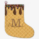 This custom Christmas stocking features a yummy looking ice cream cone design. The background is waffle cone pattern. Brown chocolate frosting drips with rainbow sprinkles is dripping from the top. A sample initial and name are printed below the icing which you can personalise to include your own name, or other custom text.