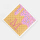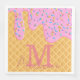 These custom plarty napkins feature a yummy looking ice cream cone design. The background is waffle cone pattern. Strawberry pink frosting drips with rainbow sprinkles is dripping from the top. A sample initial and name are printed below the icing which you can personalise to include your own name, or other custom text.