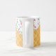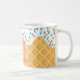 This custom coffee mug features a yummy looking ice cream cone design. The background is waffle cone pattern. White vanilla frosting drips with rainbow sprinkles is dripping from the top. A sample initial and name are printed below the icing which you can personalise to include your own name, or other custom text.