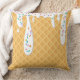 This custom throw pillow features a yummy looking ice cream cone design. The background is waffle cone pattern. White vanilla frosting drips with rainbow sprinkles is dripping from the top.