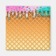 Pink, purple and mint green ice cream dripping on a waffle cone with multicolored pastel sprinkles.
