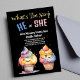 Cute and modern and trendy gender reveal party invitation card featuring a watercolor illustration of ice cream in waffle cones in pink and blue with gold icecream splash. The text says "What's the scoop? Boy or Girl?" Perfect for a gender reveal party in the summer.