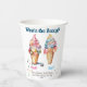 Cute and modern and trendy gender reveal party cup featuring a watercolor illustration of ice cream in waffle cones in pink and blue with gold icecream splash. The text says "What's the scoop? Boy or Girl?" Perfect for a gender reveal party in the summer.