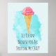 A funny pun poster which says " Ice Cream Because You Are Driving Me Crazy". Illustrated with a delicious ice cream cone drawing, with a scoop of pink strawberry ice cream held by a waffle cone. Set on an aqua blue watercolor paint splatter / brushstroke.