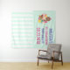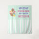 Tapestry back drop for a baby shower or other event. Illustrated with a bowl of ice cream with 3 delicious scoops covered in candy sprinkles. An ice cream cone also with 3 scoops of chocolate, vanilla and strawberry. A dessert bowl filled with neopolitan flavoued ice cream with a delicious cherry on top. A green and white stripes pattern in the background.