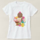 A t-shirt illustrated with drawing of a 3 scoop ice cream sundae with colourful sprinkles. An ice cream cone with scoops of chocolate, strawberry and vanilla. A bowl of neopolitan ice cream with a cherry on top. Strawberries and a pineapple fruit sit beside the bowls. Summery and sweet.