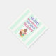 Paper napkins for an ice cream social event such as a baby shower or birthday. Illustrated with drawing of a 3 scoop ice cream sundae with colourful sprinkles. An ice cream cone with scoops of chocolate, strawberry and vanilla. A bowl of neopolitan ice cream with a cherry on top. Strawberries and a pineapple fruit sit beside the bowls. Summery and sweet. A mint green and white stripes pattern in the background.
