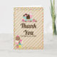 A thank you card with a sweet ice cream theme. Illustrated with a chocolate ice cream bar, 3-scoop sundae with a cherry on top, and a strawberry float. Little strawberries and cherries beside them. Colourful confetti surrounds the card with a diagonal striped background in a light brown colour. Personalised message inside. Text on the front says: Thank You for being so sweet.