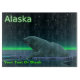 A peaceful moment in the long Arctic night. A Polar Bear rests at the edge of an open area in the pack ice. The Northern Lights glow in the distance; bright stars twinkle overhead. Text reading "Alaska" appears in glowing green and white. Customise b adding your own additional text.