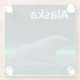 A peaceful moment in the long Arctic night. A Polar Bear rests at the edge of an open area in the pack ice. The Northern Lights glow in the distance; bright stars twinkle overhead. Text reading "Alaska" appears in glowing blue and white. Polar bears are endangered. How much longer will scenes like this be able to occur? Please help save Polar Bears from extinction.