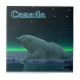 A peaceful moment in the long Arctic night. A Polar Bear rests at the edge of an open area in the pack ice. The Northern Lights glow in the distance; bright stars twinkle overhead. Text reading "Canada" appears in glowing blue. Polar bears are endangered. How much longer will scenes like this be able to occur? Please help save Polar Bears from extinction.