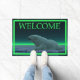 A peaceful moment in the long Arctic night. A Polar Bear rests at the edge of an open area in the pack ice. The Northern Lights glow in the distance; bright stars twinkle overhead. Text reading, "WELCOME" also appears.