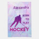Design: "Born to play hockey" + silhouette of a hockey player + personalize with the name of the skater.
