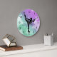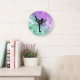 Ice Skater Design Wall Clock featuring the a pair of white ice skates against a turquoise and purple starry background, with customizable text.