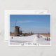 Postcard of people ice skating on the frozen river along several windmills on a beautiful winter day in Kinderdijk, the Netherlands with a white edge and in black the text 'Netherlands'.