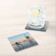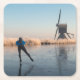 Coaster with an athlete ice skating on a frozen river past hoar-frosted reeds and a windmill on a beautiful winter morning in the Netherlands.