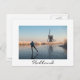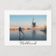 Postcard of an athlete ice skating on a frozen river past hoar-frosted reeds and a windmill on a beautiful winter morning in the Netherlands with a white border and the text: 'Holland'.