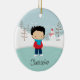 Dated & personalised cute black hair ice skater boy skating Christmas Ornament set on a snow filled background with trees & a snowman. A Wonder Christmas gift sure to be treasured for many years to come.