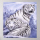 Two white tigers rest in the deep woods of these soft lavender hued snowy mountains.