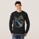 A fierce fantasy print featuring a dynamic, ice-cobalt warrior wielding a glowing blue lightning sword; frosted effects, fiery embers, bold contrast for anime/gaming apparel.