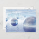3D ocean scene of reflective spheres floating downward towards the forground. An Iceburg floats in the background tip with mist against a clear blue sky.