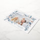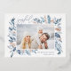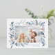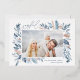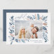 This simple and elegant nature-inspired holiday card features your favourite horizontal or landscape-orientated photo adorned at the corners with sprigs of graceful icy blue watercolor foliage with rose gold foil accents. "Joyful" appears at the top left in chic handwritten script lettering, with your names and the year at the bottom right. An elegant botanical design for your Christmas 2022 greetings.