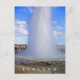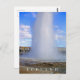A beautiful view of a geyser shooting water in Iceland printed on a postcard.