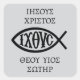 Ichthys or Ichtus Christian symbol. Fish outline with greek letters "ΙΧΘΥΣ". Custom background colour. Top and bottom custom text fields.