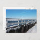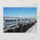 The scenic photo displays frosty white, wind blown, frozen icicles. They are dangling from a metal railing and bulkhead. Snow can be seen in front of the bulkhead. The blue water of the bay along with a blue sky, can be seen in the background. This scenic landscape photo was taken at the north end of Long Beach Island in Barnegat Light, New Jersey.