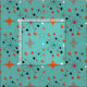 Stylish on trend pattern inspired by retro modern mid century designs with atomic starburst shapes on a white basket weave in tones of orange, grey, turquoise, black and white