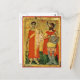 Vintage painting from wall mural. Saint Christopher swinging incense and a bearish soldier with shield beside him.
