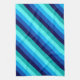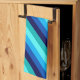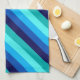 A kitchen towel featuring a cool pattern design of diagonal stripes in navy blue, cobalt blue, sky blue, icy mint teal, and light turquoise.