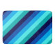 A large sized bath mat featuring a cool pattern design of diagonal stripes in navy blue, cobalt blue, sky blue, icy mint teal, and light turquoise.