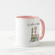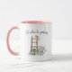 Coffee mug featuring the wording "I'd Rather Be Gardening" above a watercolor illustration of a garden rake leaning again a wooden ladder with a garden hat hung on the side of ladder and wellies, potted hyacinth and a flowers planted in a watering can. Perfect for the passionate gardener. Additional rim and handle colours and styles available.