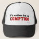 I'd Rather Be In Compton! Are you from Compton, California? Do you have a friend or family member who loves Compton, California? If so, this "I'd Rather Be In..." hat is what you're looking for! The design features "I'd rather be in" in small black lettering at the top and "Compton" in big red lettering at the bottom.