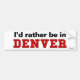 I'd Rather Be In Denver! Are you from Denver, Colorado? Do you have a friend or family member who loves Denver, Colorado? If so, this "I'd Rather Be In..." bumper sticker is what you're looking for! The design features "I'd rather be in" in small black lettering at the top and "Denver" in big red lettering at the bottom.