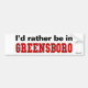 I'd Rather Be In Greensboro! Are you from Greensboro, North Carolina? Do you have a friend or family member who loves Greensboro, North Carolina? If so, this "I'd Rather Be In..." bumper sticker is what you're looking for! The design features "I'd rather be in" in small black lettering at the top and "Greensboro" in big red lettering at the bottom.
