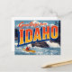 This adventurous retro-style design features the classic "Greetings from IDAHO" typography set against a rugged mountain and river landscape. The scene showcases the state's incredible outdoor recreation, with a kayaker navigating powerful whitewater rapids, set against snow-capped peaks and pine forests. Perfect for fans of vintage travel posters, retro artwork, extreme sports, the Rocky Mountains, and the wilderness of the Gem State. This is an ideal souvenir or gift for outdoor enthusiasts and Idaho fans.