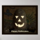 Potatoes substitute for pumpkins as Jack O'lanterns in Idaho. A potato, carved and lit in the manner of a Halloween pumpkin, sits atop a pile of spuds, set against a burlap sack. Customisable text reading, "Happy Halloween" also appears. You may change both the font and text colour.
