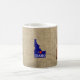 A map of Idaho, with a potato skin texture superimposed on a burlap background image. A blue silhouette map with text reading, "I (a red heart) IDAHO" also appears. Customise by adding your own additional text on the reverse side.. A simple way to show your Idaho pride.