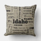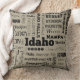 A charming pillow featuring the state name of Idaho and some of its cities and towns in black text of varying fonts and sizes on a taupe/grey background. The back is solid black with the word "Idaho" in taupe. Just flip the pillow to quickly change out the look of your room.