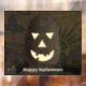 Potatoes substitute for pumpkins as Jack O'lanterns in Idaho. A potato, carved and lit in the manner of a Halloween pumpkin, sits atop a pile of spuds, set against a burlap sack. Customisable text reading, "Happy Halloween" also appears. You may change both the font and text colour.