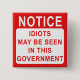 This fun protest badge is just the thing to make people laugh. Available on other products this badge is in the form of a sign and reads: NOTICE, IDIOTS MAY BE SEEN IN THIS GOVERNMENT. - A funny political sign stating the obvious! Great to send to the Prime Minster and other politicians. I'm sure they would chuckle! lol.