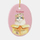 This sweet ornament has a painting of a beautiful fluffy white, brown and black patchwork kitty with gorgeous blue eyes and a garland of roses on her head. She's sitting in a box which says "If I fits, I sits". Background is pink with white polka dots and the design is on both sides.