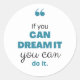 Add a spark of inspiration wherever you go with this bold and encouraging sticker! Featuring the quote "If you can dream it, you can do it!" in stylish black and turquoise text, this sticker is perfect for laptops, water bottles, journals, planners, or anywhere you need a boost of motivation.