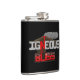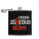 This geology humour hip flask features the pun "Igneous is Bliss," a geology spin on the common phrase "Ignorance is Bliss." The letters are drawn as grey rock and red, crystal-bearing magma mush below an active, erupting volcano.