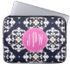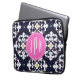 A gift which can be personalised with your monogram inside pink circle at centre. Background is navy blue and white ikat pattern.